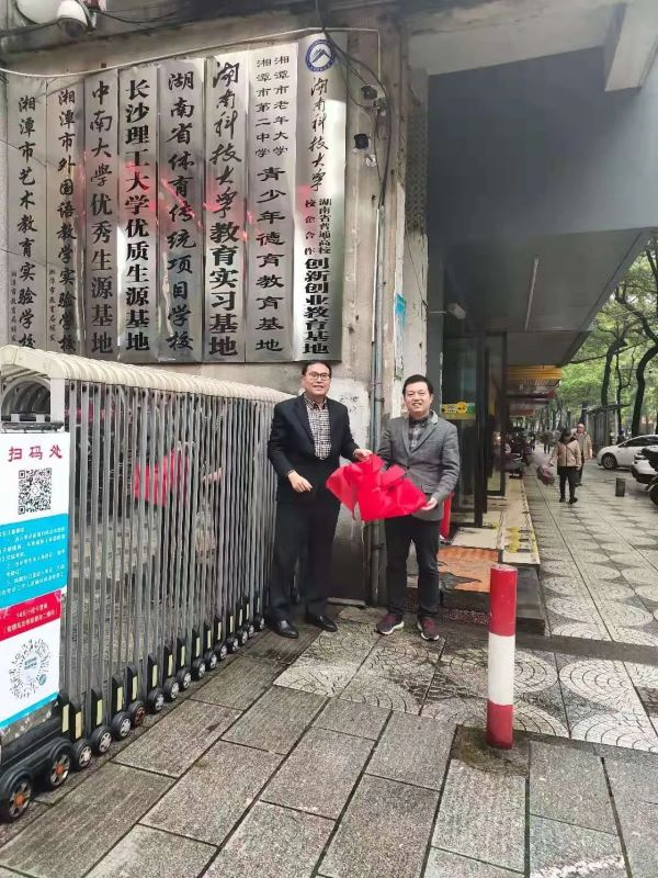 在二中门口,聂志军教授与唐新球校长代表双方喜揭红绸,共同完成揭牌仪式,湘潭市二中正式成为“湖南科技大学大学生创新创业基地”。这是一次我院与二中融通融合,创新发展的良好契机,将开启双方友好往来、通力合作的新篇章。