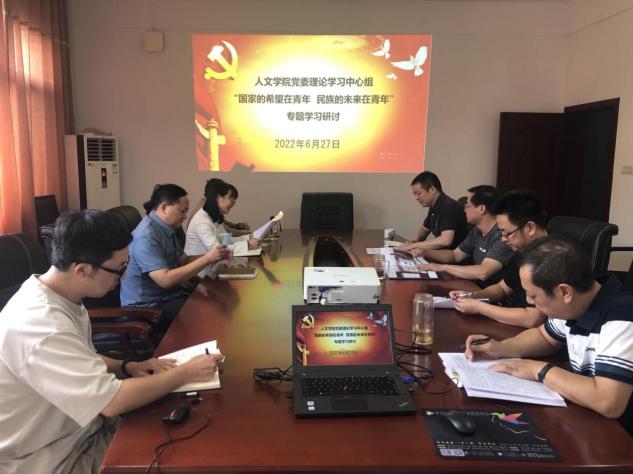 2022年6月27日,人文学院学院党委理论学习中心组在立言楼B505室开展“国家的希望在青年 民族的未来在青年”专题集中学习,集中学习由曾志东书记主持,全体党委委员和党政办负责同志参加了本次集中学习。