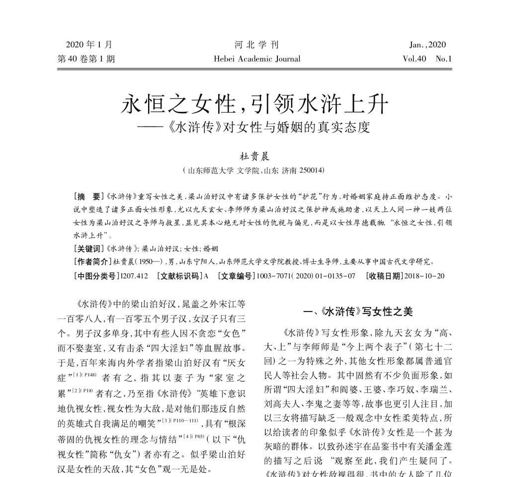 近日,我院杜贵晨教授论文《永恒之女性,引领水浒上升——<水浒传>对女性与婚姻的真实态度》发表于《河北学刊》2020年第1期。