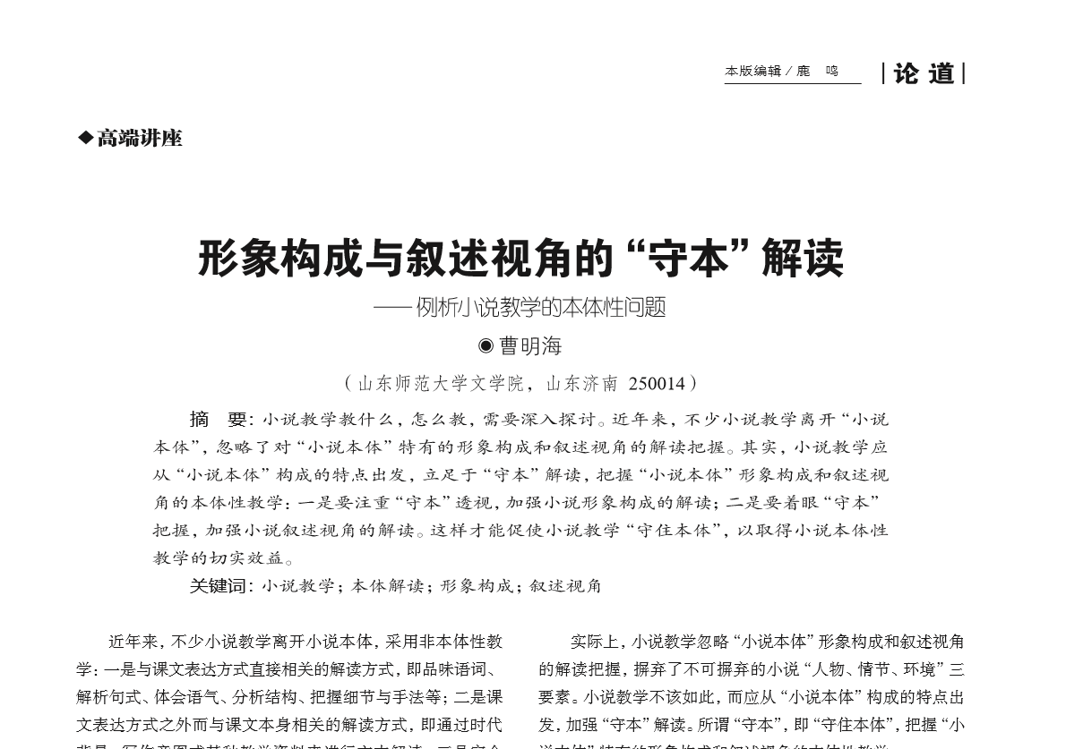 近日,我院曹明海教授论文《形象构成与叙述视角的“守本”解读——例析小说教学的本体性问题》发表于《语文教学通讯》2020年第7期。