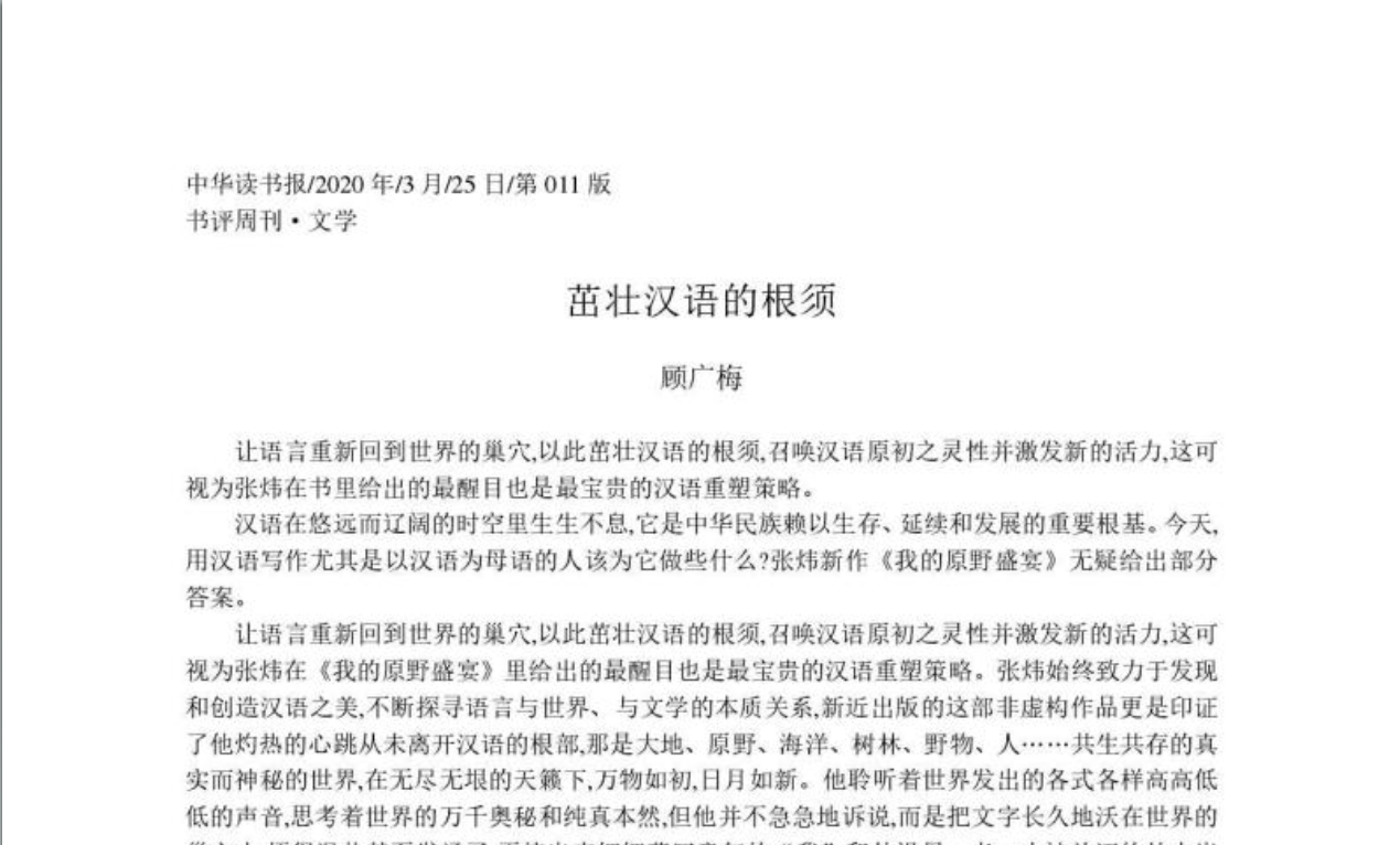 我院顾广梅教授《茁壮汉语的根须》一文发表于《中华读书报》2020年3月25日第11版,该文同步被中国作家网、人民文学出版社微信公众号等平台转载发布。