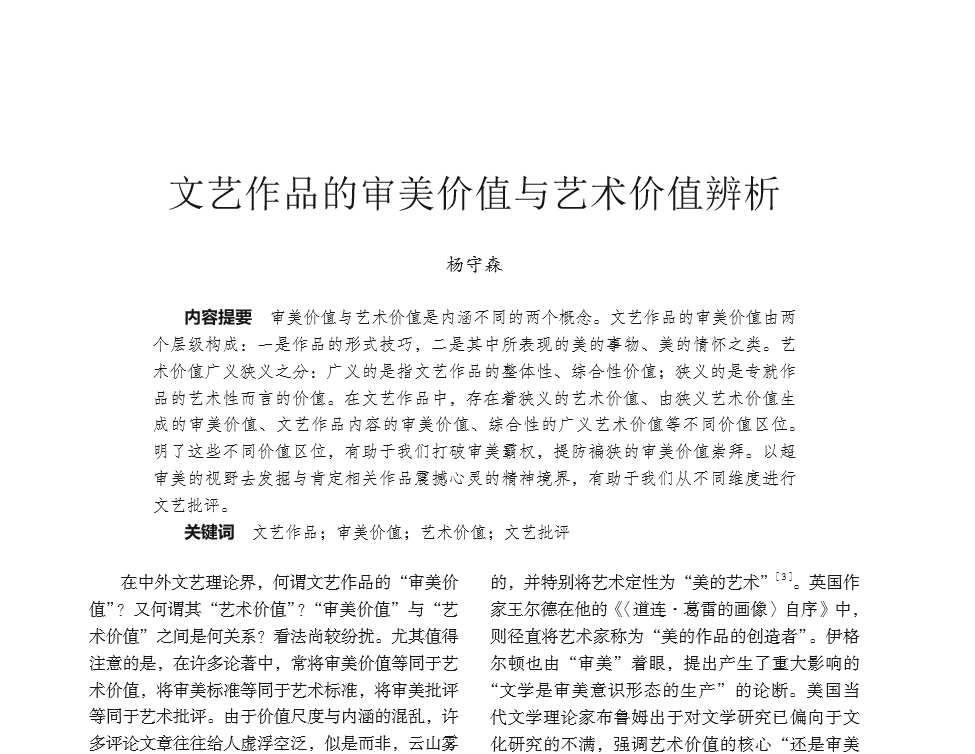 近日,我院杨守森教授论文《文艺作品的审美价值与艺术价值辨析》发表于《文学评论》2020年第3期。