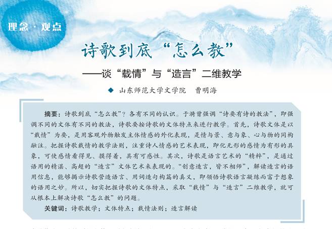 《诗歌到底“怎么教”——谈“载情”与“造言”二维教学》针对诗歌“怎么教”的问题,指出诗歌要按诗歌的文体特点,采取“载情”与“造言”二维教学。首先,诗歌文体是以“载情”为要,是用客观外物触发主体情感的外化表现,是情与景、意与象、心与物的同构融注。把握诗歌载情的教学法则,注重诗人情感的艺术表现,即化无形的感情为有形的具象,可使感情看得见、摸得着,具有可感性。其次,诗歌是语言艺术的“精粹”,是通过语用的精湛、高超的“造言”文体艺术来表现的。解读造言的语用信息,能够揭示诗歌营造语言、用词造句构篇的真义,即领悟诗歌语言凝练而富于想象的语用之妙。
