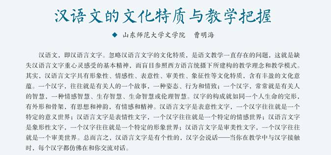 《汉语文的文化特质与教学把握》指出汉语言文字具有形象性、情感性、表意性、审美性、象征性等文化特质,含有丰盈的文化意蕴。忽略汉语言文字的文化特质,是语文教学一直存在的问题,要解决这个问题,对策就是把握汉语言文字的文化特质,切实探究汉字与文化、汉语与文化构成的关系,引导学生深入汉语言文字构成的文化意蕴世界,加强对汉语言文字文化内涵的品味与涵泳,切忌抽筋剥骨式的教学操作。