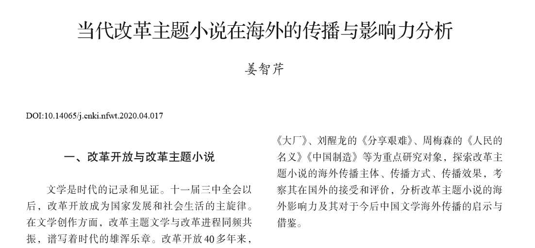 近日,我院姜智芹教授的论文《当代改革主题小说在海外的传播与影响力分析》刊发于《南方文坛》2020年第4期。