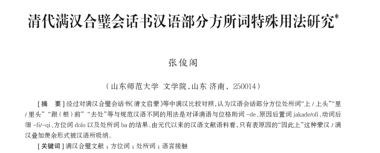 近日,文学院张俊阁副教授论文《清代满汉合璧会话书汉语部分方所词特殊用法研究》发表于《古汉语研究》2020年第3期。