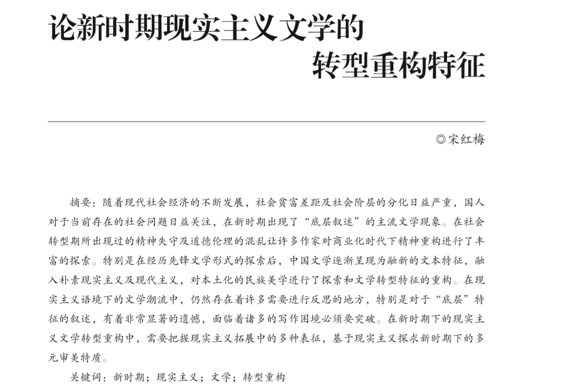 近日,文学院宋红梅老师的论文《论新时期现实主义文学的转型重构特征》刊发于《当代文坛》2020年第5期。