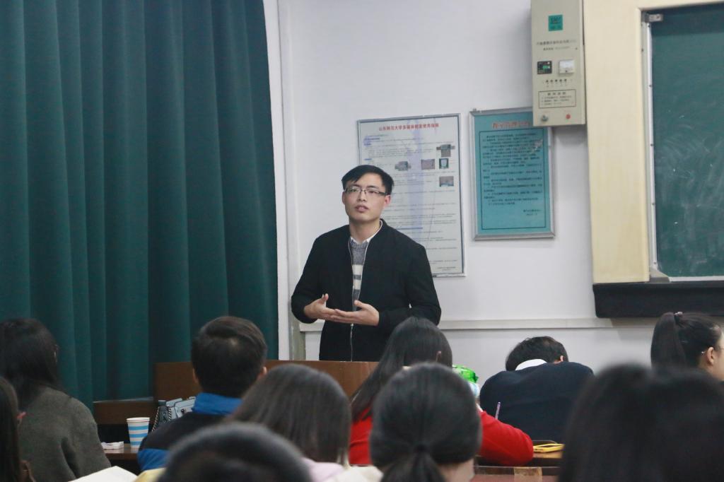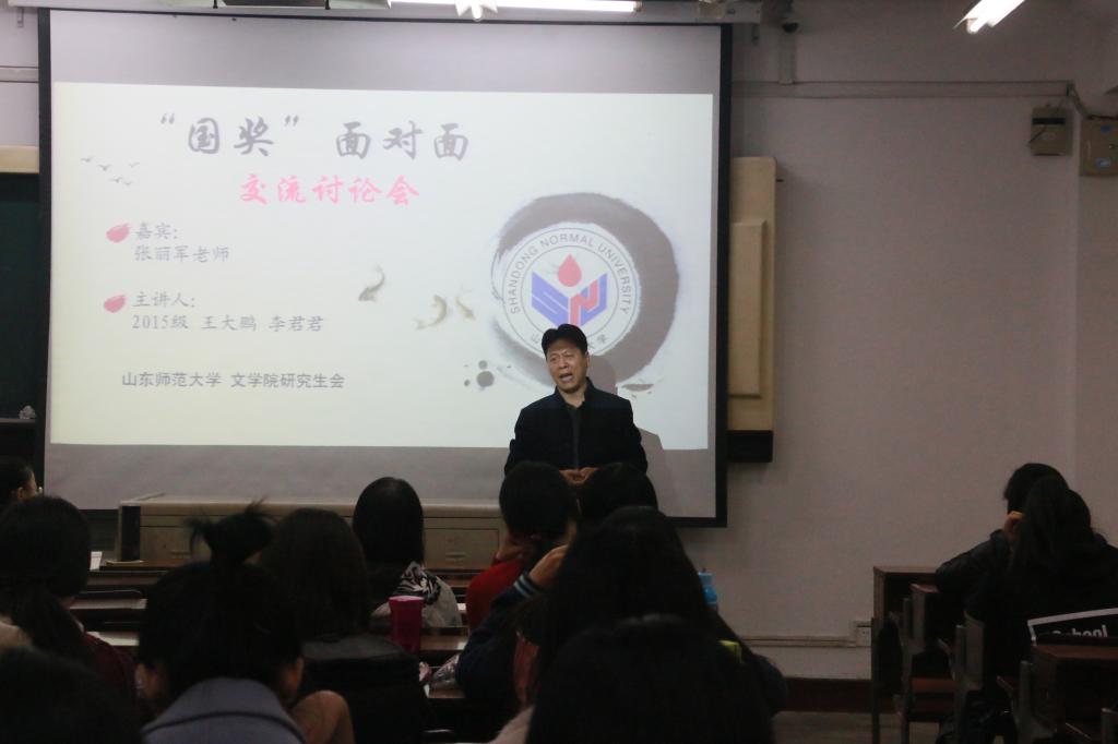 10月30日晚,文学院研究生“国奖面对面”学术经验交流会在千佛山校区教学三楼3309教室举行2017年“国家奖学金”获得者2015现当代文学专业研究生王大鹏和李君君担任主讲,文学院副院长、教授,博士生导师张丽军出席会议并讲话,各专业研究生踊跃参加、认真聆听了交流会。