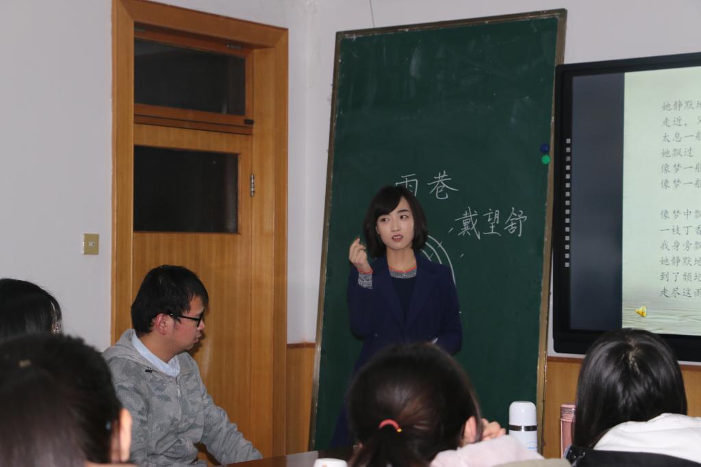 接着,张露露讲解了从事语文教学的三个必备环节。第一部分为“说课”,她详细介绍了说课的含义、要求及具体步骤,对“说教材”、“说学情”、“说教学目标”、“说教学方法”、“说教学过程”五个部分进行展开阐释。随后以诗歌《雨巷》为例,与同学们探讨授课步骤与环节的设计。在第二部分“授课”中,她从语文教学的专业角度展示了授课及备课时各部分的要求,指出了实际教学设计中可能出现的问题与误区。第三部分为“答辩”,张露露从教学和学生管理两方面,结合课件制作排版及字体等方面做了详细说明。“所能授者,规矩方圆;不能授者,只能寄于心营意造”,她以两句寄语总结了以上“干货”,诗意地暗喻了语文教学的关键所在。最后,她以诗歌《雨巷》的模拟课堂为在座的同学展示了语文课堂的精彩与魅力,也激发了大家参与语文教学的热情,现场气氛融洽,掌声不断。