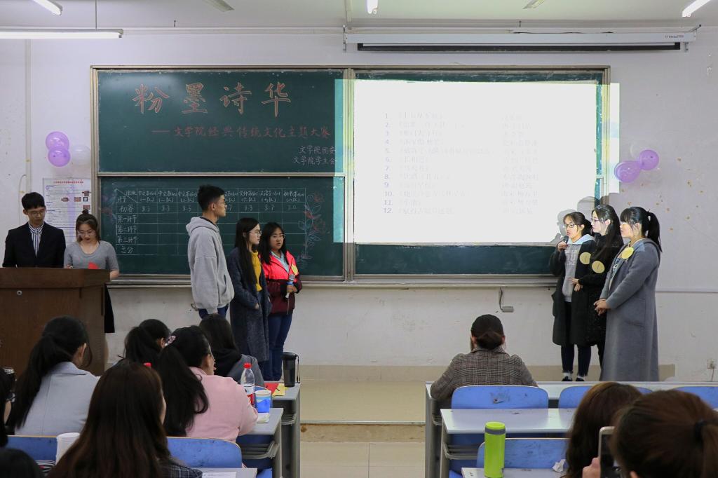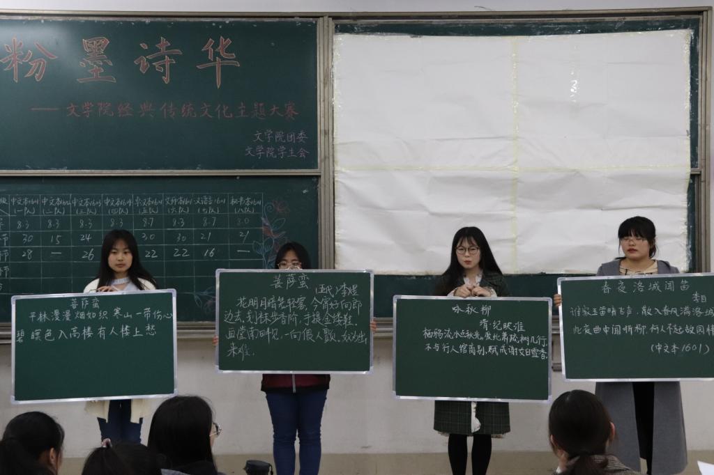 为弘扬经典传统文化,丰富学生课余文化生活,提高学生粉笔字书写水平,4月14日,文学院2016级、2017级分别于长清湖校区综合教学楼C区218教室举办“粉墨诗华”——经典传统文化主题大赛。学院2016级、2017级共四百多名学生到场观看了本次比赛