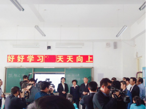 在听完维族学生用标准普通话朗诵的课文后,刘家义书记对学生的国语水平及支教教师的教学工作表示了肯定和赞许。将要离开课堂时,书记再次与支教教师孙帅亲切地握手,真诚地说道:“辛苦了。”