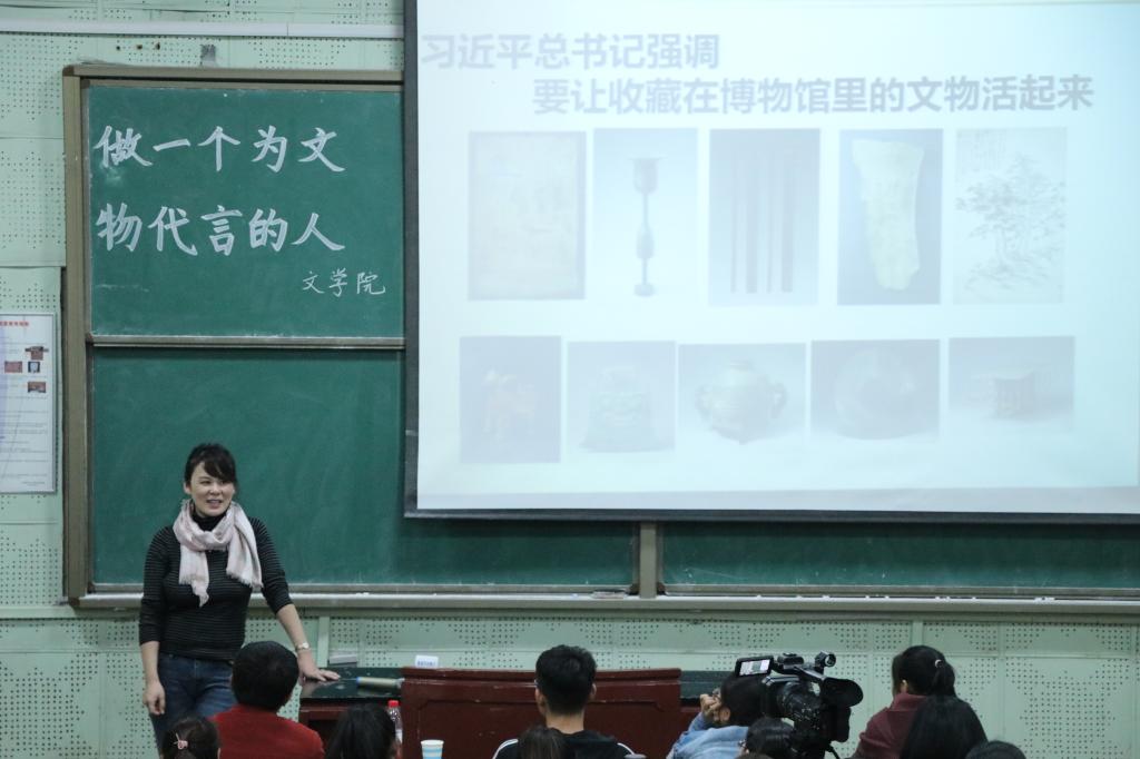 为了提高同学们为文物代言的责任意识,呼吁同学们积极加入山东博物馆志愿者团队,10月25日下午,由文学院团委举办的“做一个为文物代言的人”讲座在千佛山校区二号教学楼2313教室拉开帷幕,本次讲座由文学院党委副书记巩固主持,邀请山东博物馆宣教部主任、山东省演讲学会副会长姜惠梅担任主讲人。文学院2018级辅导员李红,部分研究生及二百余名2018级学生一同聆听姜惠梅的精彩讲解。