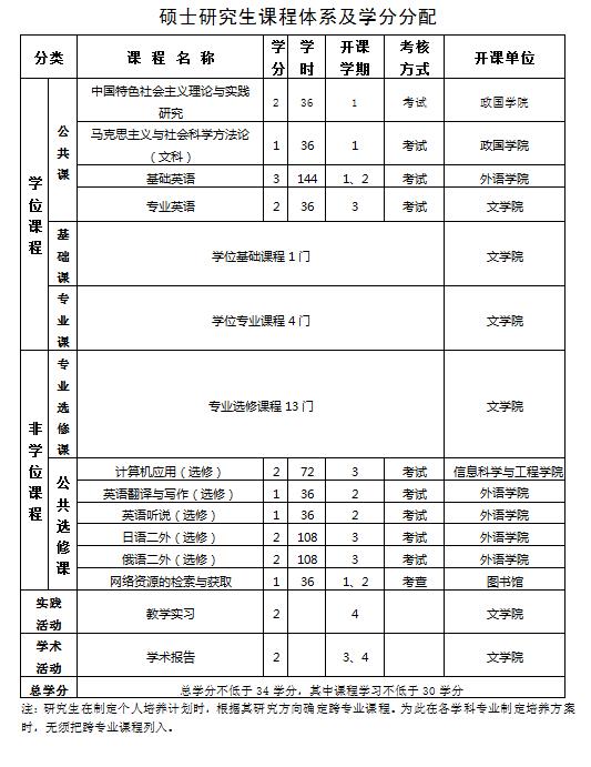 我校硕士研究生课程实行学分制,课程学分不少于30分,另实践活动、学术活动各2学分,课程分为学位课程和非学位课程,具体结构为: