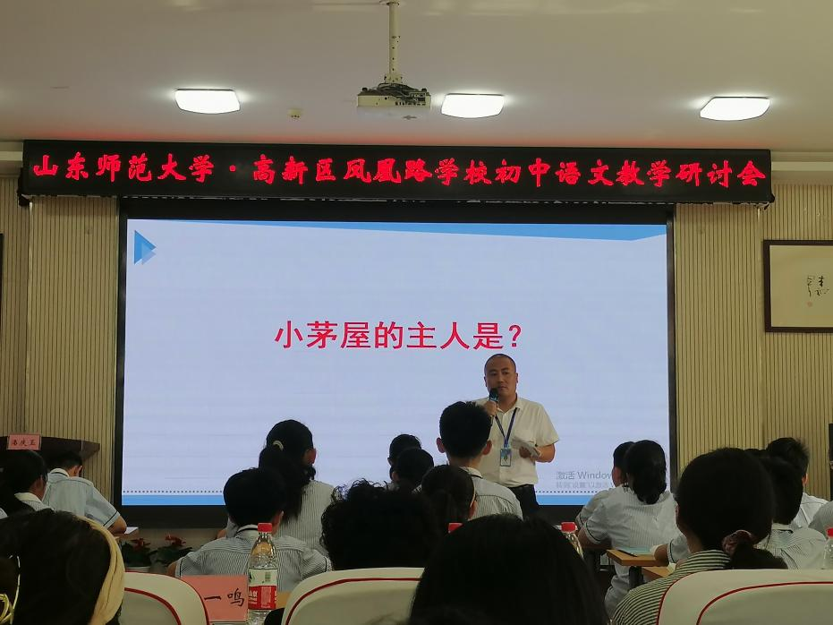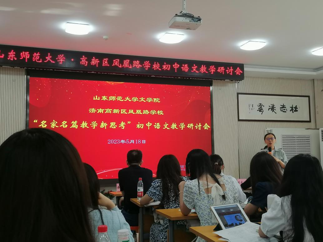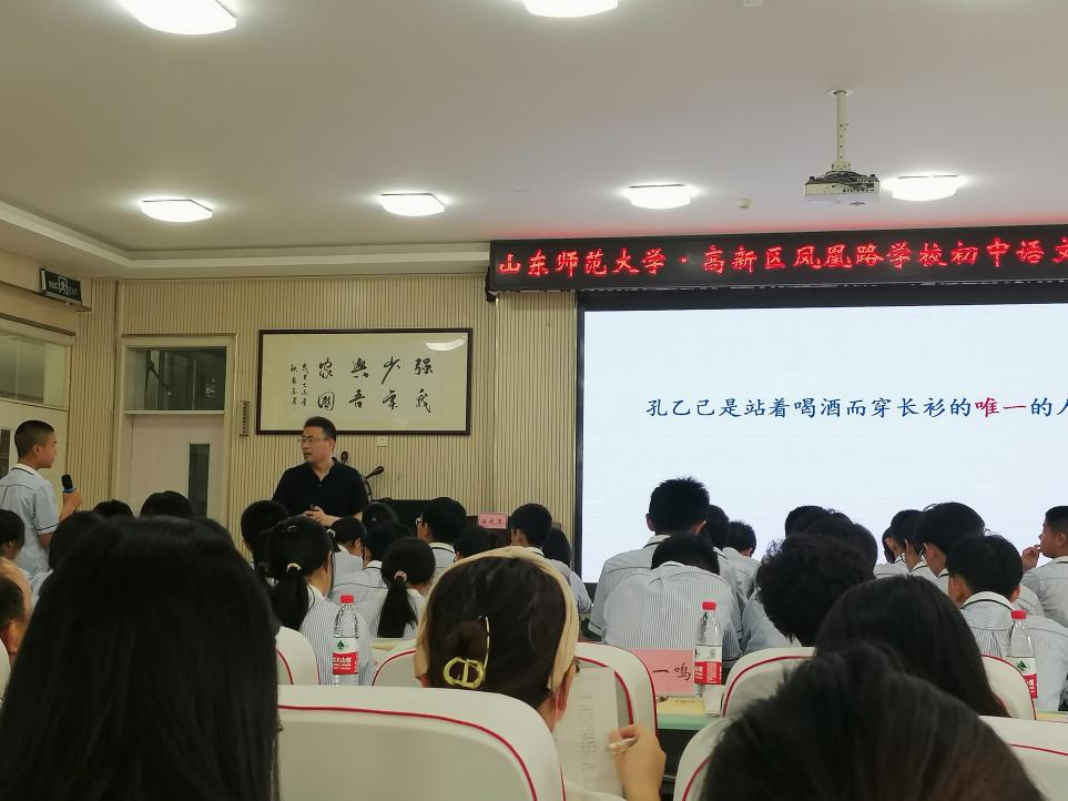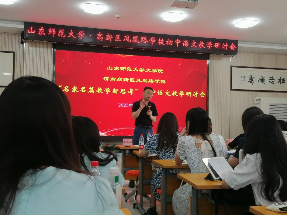 2023年5月18日下午,“‘名家名篇教学新思考’初中语文教学研讨会”在济南市高新区凤凰路学校举行,山东师范大学文学院教授、博士生导师潘庆玉执教《孔乙己》,并作上课经验分享。济南市高新区教育局局长高一鸣、高新区教研室主任李继冶、高新区教研员刘庆阳、凤凰路学校校长王兆贞、山东师范大学文学院课程与教学论教师范维伟、凤凰路学校全体语文教师及文学院2022级课程与教学论和学科教学(语文)专业的研究生参加会议。