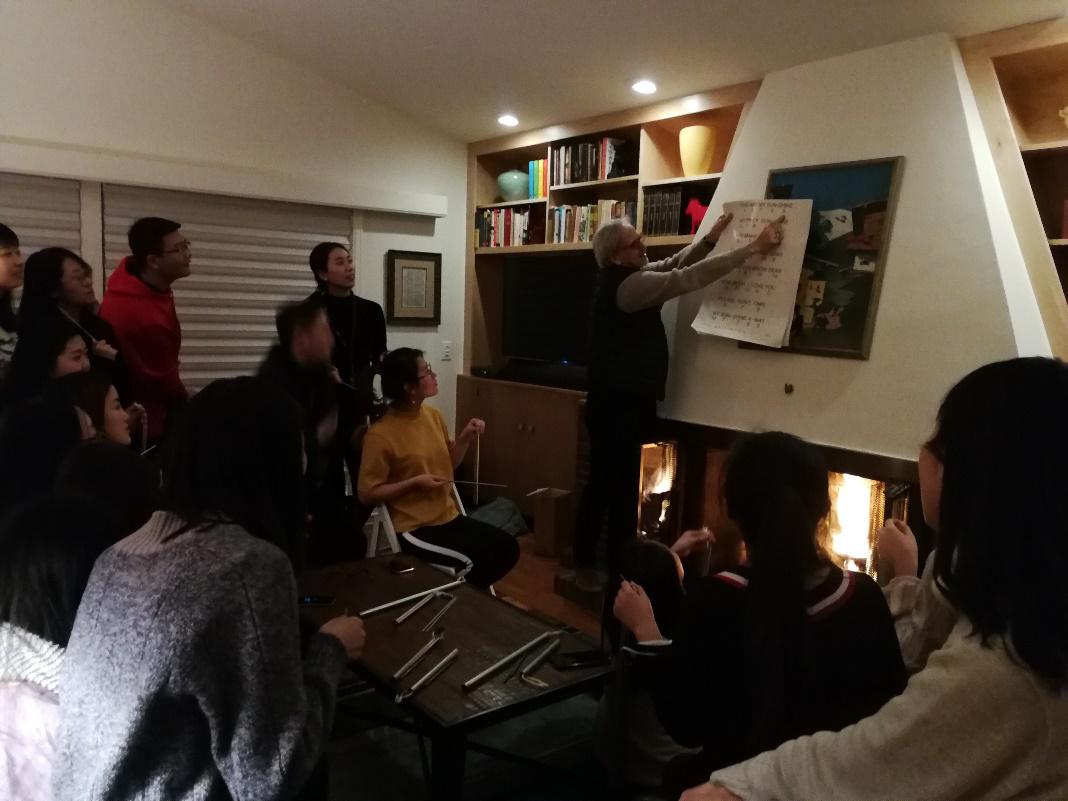 晚上,我们应邀来到奥尔巴尼大学校长助理Mark先生(也是此次访美活动的美国校方项目负责人)家吃晚餐,下了公交车,就看到Mark和夫人在门口热情地迎接我们。一进房间就感到扑面而来的暖意,客厅里的大壁炉燃烧地正旺。Mark热情地招呼我们用餐,披萨、沙拉、饮料很是丰盛,我们在餐厅边吃甜品边讨论中美房价等问题。晚餐后,大家聚到壁炉旁,Mark拿出他们家庭聚会时一起演奏的乐器,指导大家一起演奏了You Are My Sunshine和Jingle Bells,同学们也不甘示弱,两位音乐学院的同学展示了自己最拿手的歌曲和舞蹈,大家还一起演唱了茉莉花、小苹果等,交谈甚欢,似乎忘却了此刻身处异乡他国,取而代之的是家的温暖。