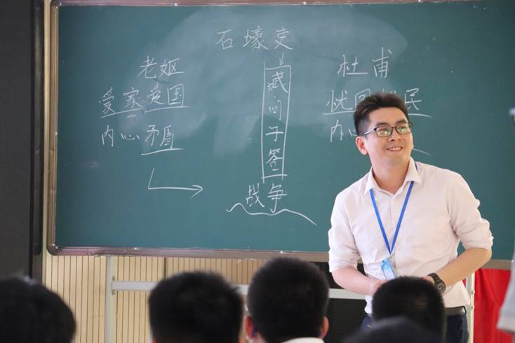 此次活动第二阶段为课堂展示及点评环节。首先是褚凤辉老师带来的作文指导课,褚老师以“辞——情——理”为线索带领学生学习了如何从语言、立意、理趣三方面写出好作文,以学生日常习作为课堂资源,整堂课脉络清晰,气氛活跃而不失严肃,为在座的研究生同学带来了有关写作教学方面的诸多启示与思考。