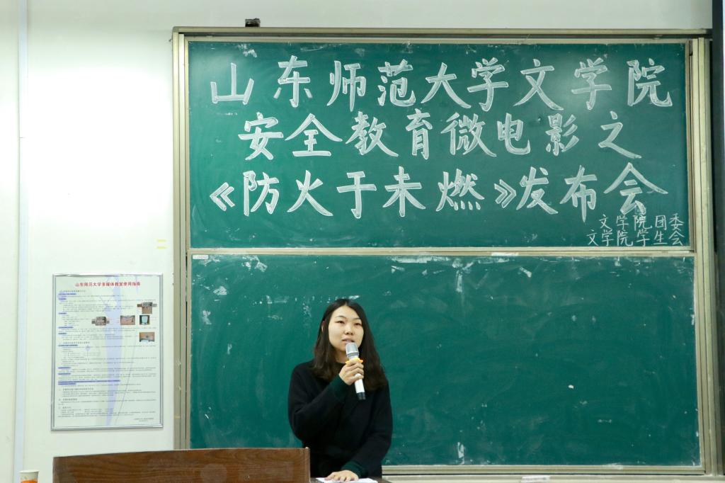 发布会初始,宫晓菁与在场同学一同回顾了文学院与长清区大学路派出所合作拍摄了三期以“防盗”、“防骗”和“反传销”为主题的“朱警官说防范”系列微电影。随后,李嘉琦老师作出简练致,她以近年来学校本部校区女生宿舍着火和上海商学院火灾等具体事例告诫同学们要重视防范安全事故,在日常生活中要提高安全意识,防患于未燃。然后宫晓菁播放了微电影《防患于未燃》,这部电影讲述了男生宿舍四人因自恃做事谨慎而在宿舍内不顾卫生准则,肆意使用违章电器的一个故事。观影过程中,观众们都颇有共鸣,或掌声连连或阵阵喝彩。影片尾声并没有将结局演绎出来,旨在给观者留下想象的空白,以“无声胜有声”的方式来警醒同学们安全的重要性。紧接着,宫晓菁以访谈的形式邀请四位主创上台与同学们畅聊电影幕后的趣闻轶事。对于这部作品,兰润民谈到电影制作过程颇为漫长,拍摄过程中也遇到了各种瓶颈,并与观众们一同分享了拍摄花絮。此外,兰润民还对倾注了热情与心血的全体工作人员表达了感谢希望能让观众们可以在观看影片之余能够真正认识到安全的重要性,提高自身的防患意识。值得一提的是,同学们积极与几位主创进行互动交流几位主创也热情耐心地回答了观众们所提出的问题使同学们进一步加强了安全责任意识。最后,兰润民宣读安全倡议书,向同学们发出七点倡议,希望同学们从自我做起,成为有素质、有担当、有责任、有道德的当代大学生。宫晓菁引用汪国真的“只要热爱生命,一切都在意料之中”名言再次呼吁同学们要珍爱生命,远离火患,在以后的学习和生活中增强安全防范意识,提高火灾自救的能力,真正做到“防患于未燃”,一同守护校园安全。本次微电影发布会在同学们的热烈掌声中落下帷幕。