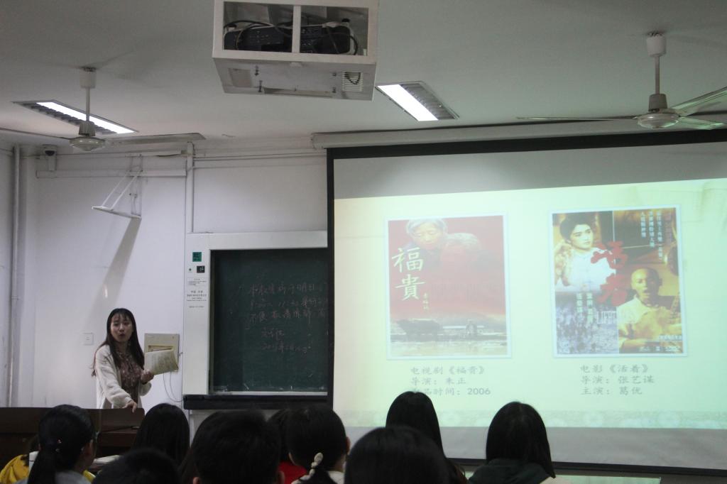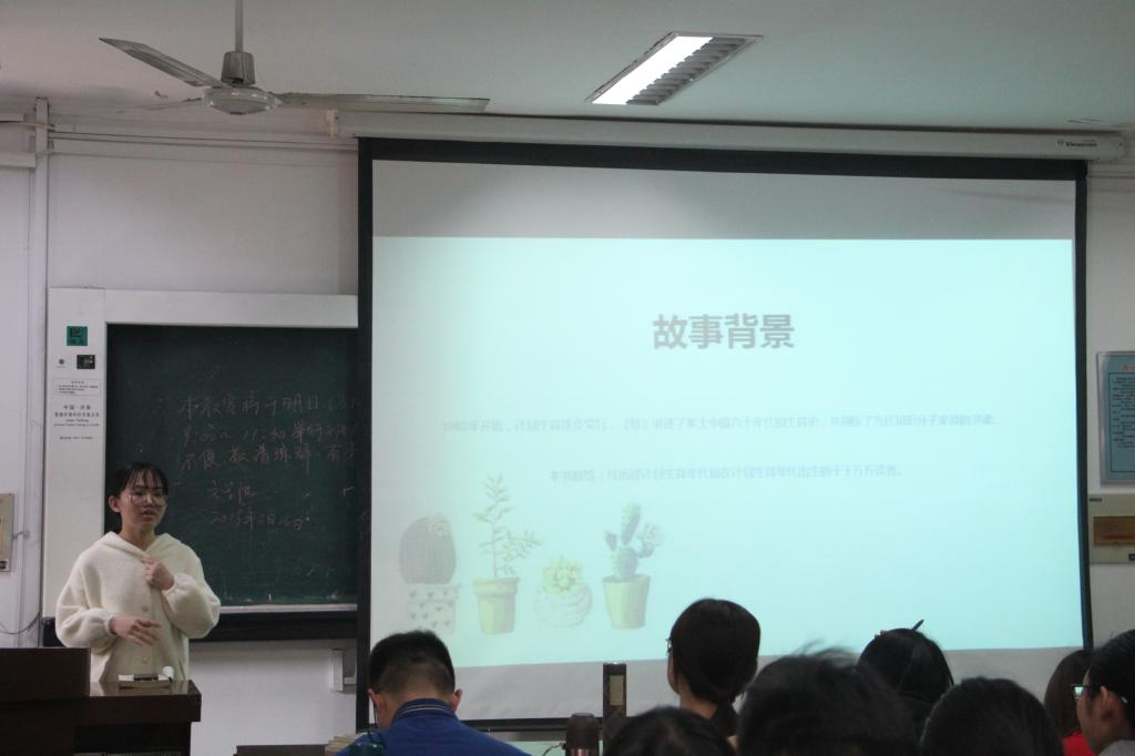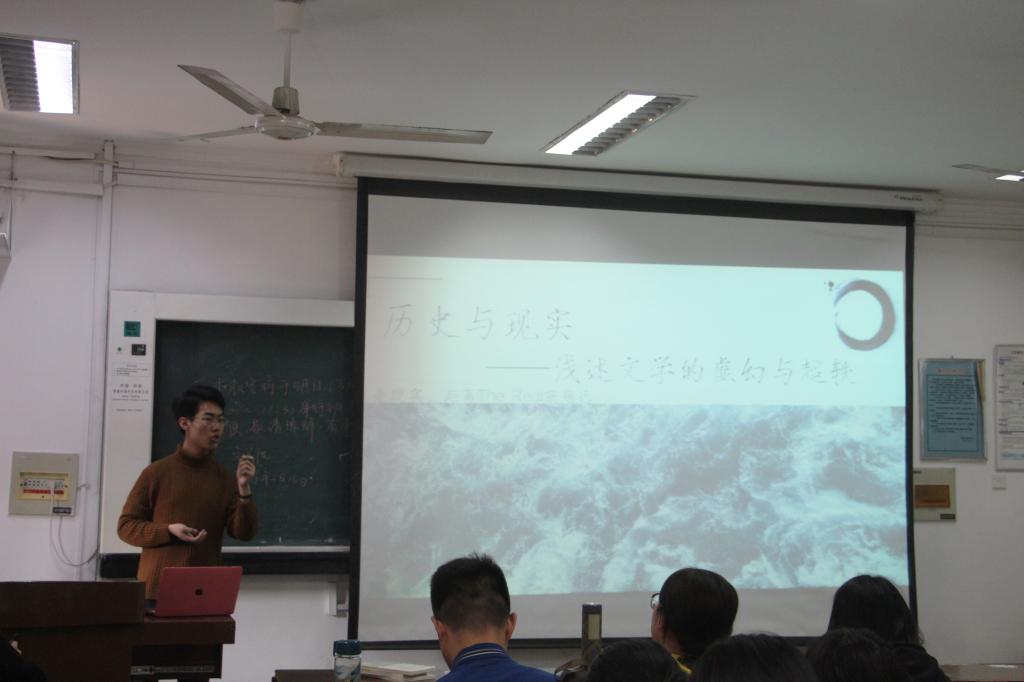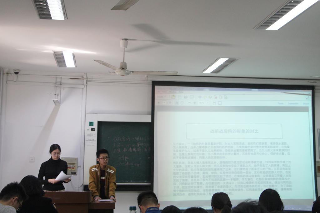 本次读书成果汇报会围绕着“分享阅读故事,开拓阅读视野”的主题,共分为小组分享和老师点评两部分,小组分享部分由8组同学代表就《古船》、《聊斋志异》、《活着》、《杀死一只知更鸟》、《蛙》、《边城》与《红高粱家族》对比分析、“历史与现实——浅谈文学虚幻与超轶”与“人物在小说中的善恶位移”8个主题进行集中汇报与交流。前五组同学主要通过具体分析单一文本的方式进行读书汇报。其中,第一组同学代表陈嘉林从小说文本的总体把握出发,通过家族分析和意象分析两方面进行“忧患意识”、“痛心疾首地沉思”与“思想者的倾诉”阅读汇报,为本次汇报会提供了一个良好开端。第三组同学代表孙玉慧则从电影出发谈《活着》一书的文学价值与现实意义,结合自身阅读体验深入剖析小说内容,同时落脚于“主人公福贵的活着,并非逆来顺受而是对生命本身的尊重”,最后呼吁同学们要“活出自我、活得幸福。”感情真挚,将汇报会气氛推向高潮。第五组同学代表龙瑛通过自身对计划生育的记忆切入小说,分析《蛙》的横向衍生性叙事,指出小说的陌生化隐喻与知识分子的不彻底性,分析鞭辟入里,引人深思。随后的三组同学则突破了单一化文本的限制,结合阅读的多部书籍进行系统化、层次化、理论化的比较与分析。其中,赵延柯为代表的小组就“历史与现实——浅谈文学虚幻与超轶”这一主题进行深入探讨,通过组员们对《午后曳航》、《大乔小乔》、《生死疲劳》、《红字》和《兄弟》五本超越中外文化书籍进行阅读报告的方式,表达自身对历史与现实的认识,同时指出当前同学们进行阅读时“似懂非懂”的现实状态,引发现场同学的强烈共鸣。孔哲同学则代表小组成员结合文本说明小组成员对莫言“在善与恶之间,美与丑之间,爱与恨之间,应该有一个模糊的地带”一语的理解,具有独特见解与体验。随后的老师点评环节,李大可老师首先总结本次读书汇报会,她指出,本次汇报会体现了同学们不同的学习汇报特色,可分为“良师益友”、“哲理思辨”、“学者”等多种类型,用幽默的语言表达了其对同学们的赞赏与鼓励。随后逐一分析各组同学汇报的特色与优缺点,鼓励同学们多角度进行阅读,寻找文学思考的独特性,为同学们提出新建议、开拓读书新思路。经过近三个小时的学习交流,本次读书成果汇报会圆满结束,在场同学们纷纷表示意犹未尽、获益匪浅。