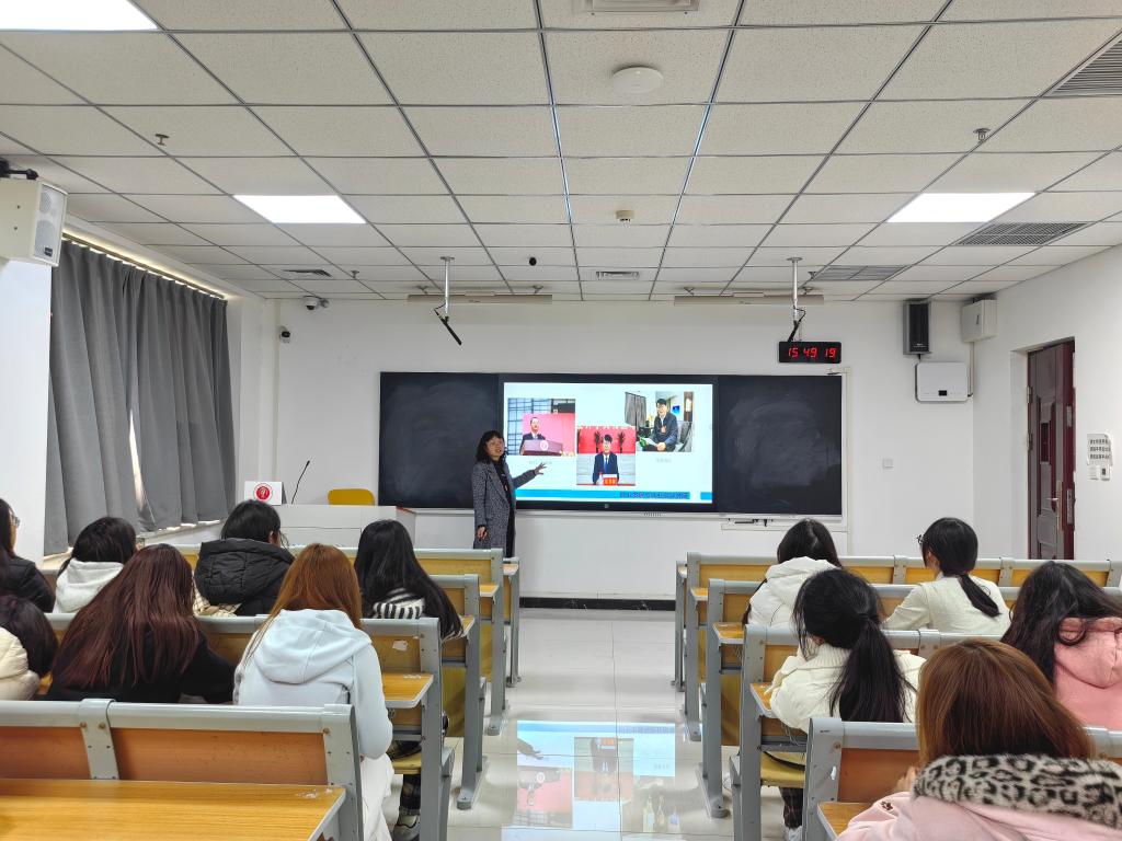 报告伊始,王佳结合大一新生普遍面临的“茫、盲、忙”现实困境,引出“大学应培养何种精神”这一核心命题。她从心理与社会文化双重维度解析“精神”内涵,重点阐释了“独立思考、学术求真、责任担当、开放包容”四大精神特质。随后,王佳围绕习近平总书记在2023年全国优秀教师代表座谈会上提出的“教育家精神”,深入解读其“师魂、师能、师爱”的深层内核,并结合党的二十届四中全会“统筹教育、科技、人才强国”的战略部署,帮助师范生深刻理解新时代对教育工作者提出的新要求,以身边的优秀教师洪琨、刘永革、任明杰的感人事迹增强同学们对教育家精神的理解。最后,她系统提出“大学四步规划法”:大一进行职业探索、大二培养定向能力、后续阶段聚焦专业实践与求职训练,为师范生成长成才提供了清晰的路径指引。