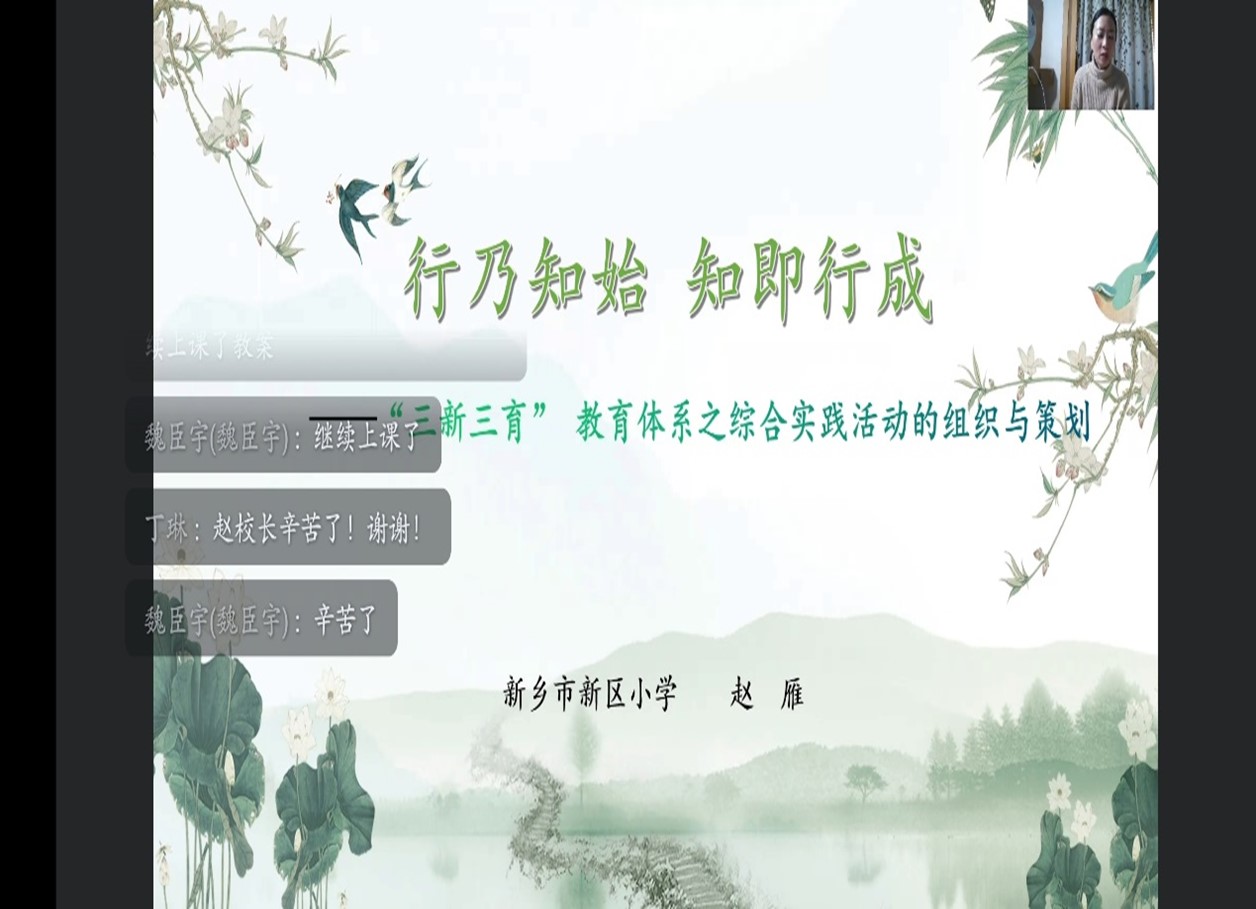 12月23日上午,我院有幸邀请到新乡市新区小学赵雁校长为大家讲述《行乃知始,知即行成》的专题,强调了开展中小学综合实践活动的重要性。为我们的学员从事教育工作提供了更深入的教育经验。
