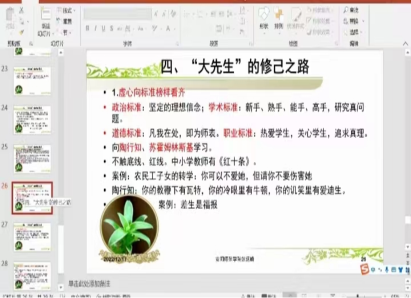 12月17日上午,由安阳师范学院副校长姚远峰教授为大家讲授了关于如何在新时代成为立德树人的“大先生”。姚副校长在讲解的过程中引用了许多名言并且列举了许多生动的事例,强调成为新时代立德树人的“大先生”,需要坚持四个相统一:坚持教书与育人相统一;坚持传言与身教相统一;坚持潜心问道与关心社会相统一;坚持学术自由与学术规范相统一。