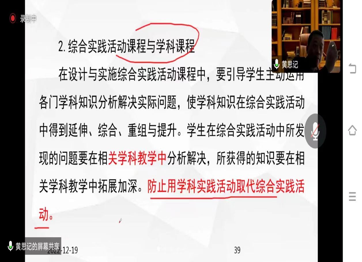 2022年12月19号,我院有幸邀请到安阳师范学院教育学院副教授黄思记老师给学员们讲授了《综合实践活动纲要解读》。黄思记老师与各位学员在线上展开了积极互动,提问解答环节,强调综合实践活动是面向学生的整个生活世界,需鼓励学生跨领域,跨学科学习。在过程中需使用“多维度”方法,促学生个性特长、实践能力、和社会责任感等不断发展。为我们学员们从事教育工作传授了宝贵的教育经验。