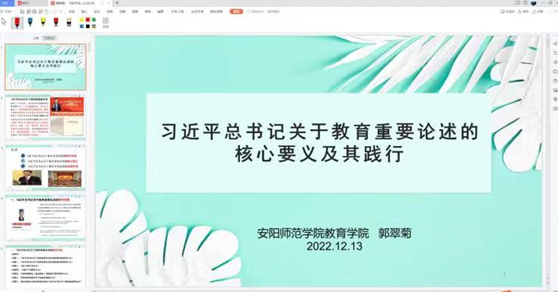 12月13日上午,安阳师范学院教育学院的郭翠菊副院长为学员们带来了《习近平总书记关于教育重要论述的核心要义践行》,提出做一个好老师需增强综合素质、培养奋斗精神、增长知识见识、坚定理想信念、厚植爱国主义情怀、加强品德修养。