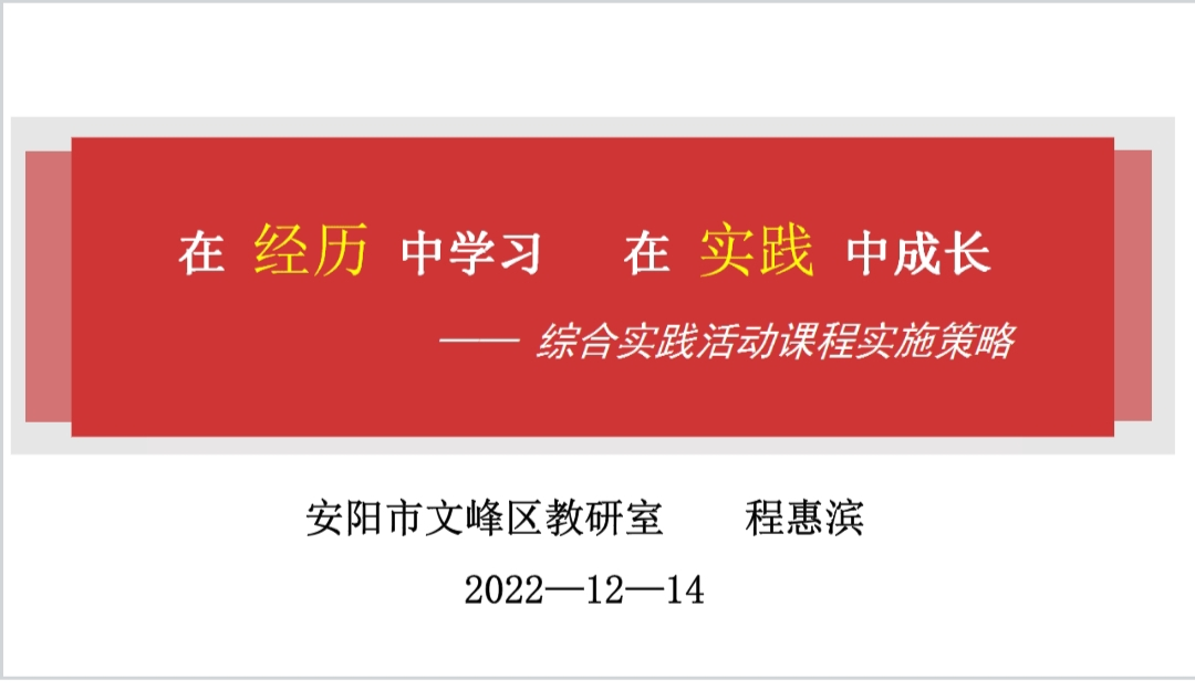12月14日上午,安阳市文峰区教研室教研员程惠滨老师,讲述了《在经历中学习,在实践中成长》的专题,强调综合实践课程的实施一定要带领学生们亲身实践,不能纸上谈兵,我们要帮助学生学会探究和体验生活。