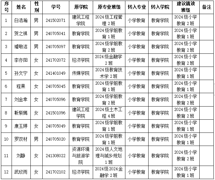 教育学院关于接收2024级转专业学生名单汇总表