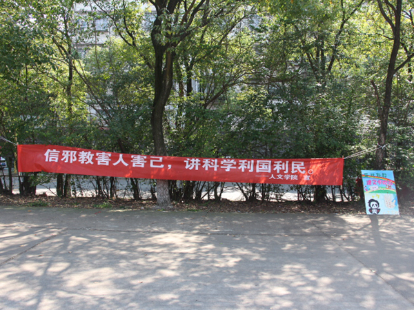 自军训开始,我院便踊跃安排并组织反邪教活动各项事宜。团委学生会在学院老师的指导下各司其职,发挥自身功能,借助学院官方QQ、微信等多媒体平台,宣传反邪教知识,为活动开展前期预热。“一只手自右下角坚定地伸出,上方写着四个不——不听、不信、不传、不参与,‘反对邪教,建文明校园’九个大字映入眼帘,校园因学生有健康的心态而更显生机勃勃。”广告部的反邪教海报在细致生动中发人深省,得到新生的连连肯定和谨慎思考。同时反邪教的宣传标语也早早的贴到了我院的宣传栏上,10月6日,印有“反邪教害人害己,讲科学利国利民”的红色横幅挂到了军训现场。