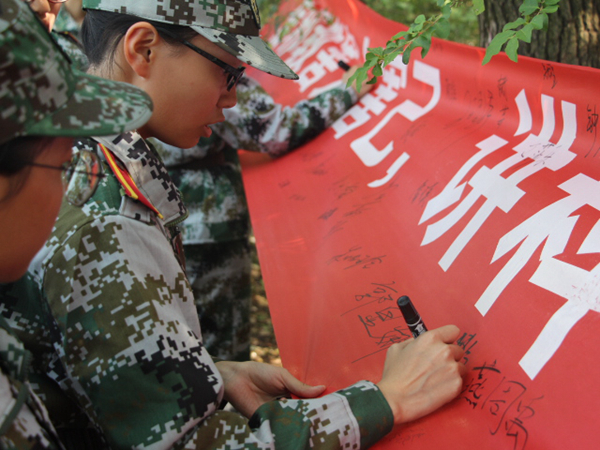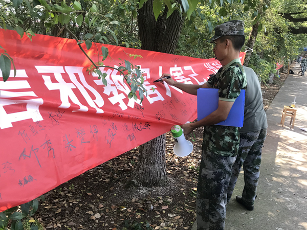 古有签字画押,今有人文学院签字为证。新生们表情严肃,拿起马克笔,郑重地在横幅上签下了自己的名字,这不仅是一种共识行为,更承载着新生们无比坚强的意志和诺允。在场的教官也纷纷参与到活动当中来,“这样的活动很有意义,现在邪教势力无孔不入,开展这样的活动能让学生增强对邪教的正确认识,净化他们的精神世界。”我院军训教官连长王阳也竖起大拇指为反邪教活动点赞。