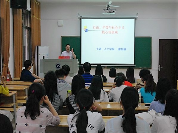 本次专家讲座分为两场,分别邀请人文学院党委书记廖加林教授和我校社科处副处长、人文学院李胜清教授作主题讲座。廖加林教授的讲座主题是《自由、平等与社会主义核心价值观》,廖教授在讲座中从“核心价值观”的定义谈起,从哲学社会科学的角度全面分析了社会主义核心价值观。他借用苏格拉底的名言“未经省察的人生是没有价值的”,鼓励、引导同学们要重视个人的三观,努力发掘自己在个人、社会、国家等三个层次的价值。
