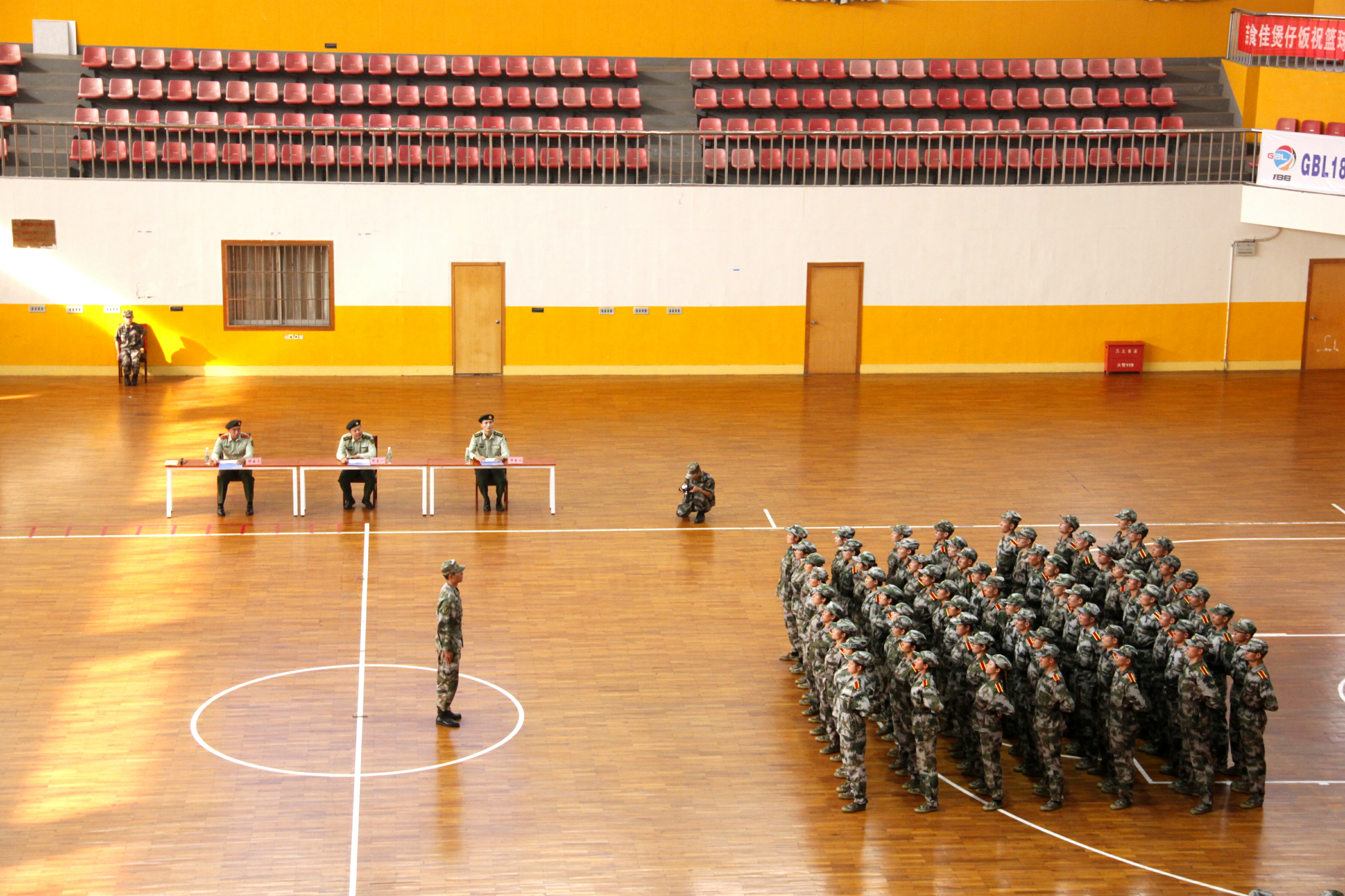 据悉,为保证比赛的客观公正,此次队列会操评比采取抽签的形式,并在评比结束之后公布各个学院的出场顺序。我院作为第三个出场的学院,学员们整装待发。北校篮球馆外,我院方阵队在尹教的带领下早早来到篮球馆外集结完毕,身穿迷彩服的方阵队成员们个个精神抖擞,表情严肃,在教官雄浑嘹亮的口号声中,步调一致地走进体育馆内。新生们整理着装,检查腰带,还不时互相检查军容,为这场队列会操评比做最后的准备。