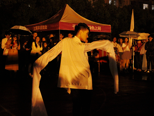 此次晚会的表演者主要为我院各个社团成员,青鸟琴行及团委学生会主席团及部分部门学生干部。晚会开始前,由文艺部带来的一支热舞首先预热了全场的气氛。在观众们的未褪的掌声中,青鸟琴行带来了几首弹唱节目。在演唱《成都》时,青鸟琴行欢迎教官及新生上场演唱,二排陈教的上场点燃了现场气氛。古典的旋律响起,清风公关礼仪社和星野书画社带来的表演《梦回雨巷》令人如同置身江南烟雨;赵思宇带来的京剧《打虎上山》令观众感受到国粹魅力;古莲汉韵社带来的汉舞《礼仪之邦》在红袖翩翩中舞出汉风古韵......而接下来的节目:语言艺术团合唱的歌曲《军训之送给黑漆漆的你们》、冰火动漫社的舞蹈《交织together》、毛研会带来的手语《明天会更好》、主席团大合唱则给现场送来了更多青春的气息。