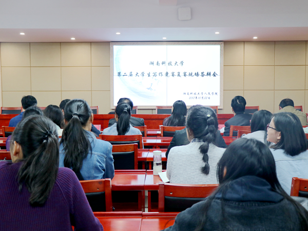 为推动中文专业教学改革,贯彻落实关于大学生学科竞赛和创新论坛的文件精神,提高学生实践能力和写作水平,10月22日晚,我院参与举办的湖南科技大学第二届大学生写作竞赛在文科楼B4-1教室举行。出席本次答辩会的专家评委有教务处副处长夏莉,社科处副处长李胜清、人文学院院长刘奇玉、党委副书记邓辉、副院长聂志军、王友胜教授、彭在钦教授等。