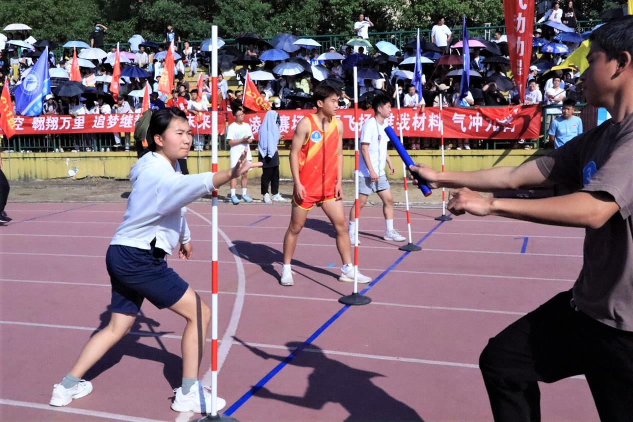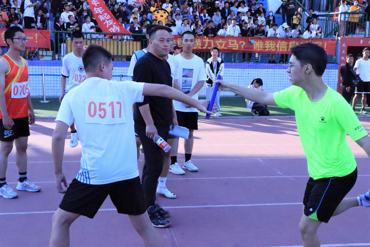 赛场英姿彰倨傲,步随风起尘飞扬。11月1日,运动会接力赛正式开始。深秋已至,骄阳依旧,北校第一田径场早已被观众的呐喊声点燃,一颗颗年轻炙热的心被赛场上的运动员们所牵动。作为团体项目,接力赛更是吸睛十足,接力棒于人文学院运动员紧握手中,等待着被交到下一棒。这小小的接力棒传递着团体之力量,诠释着奋斗与拼搏。