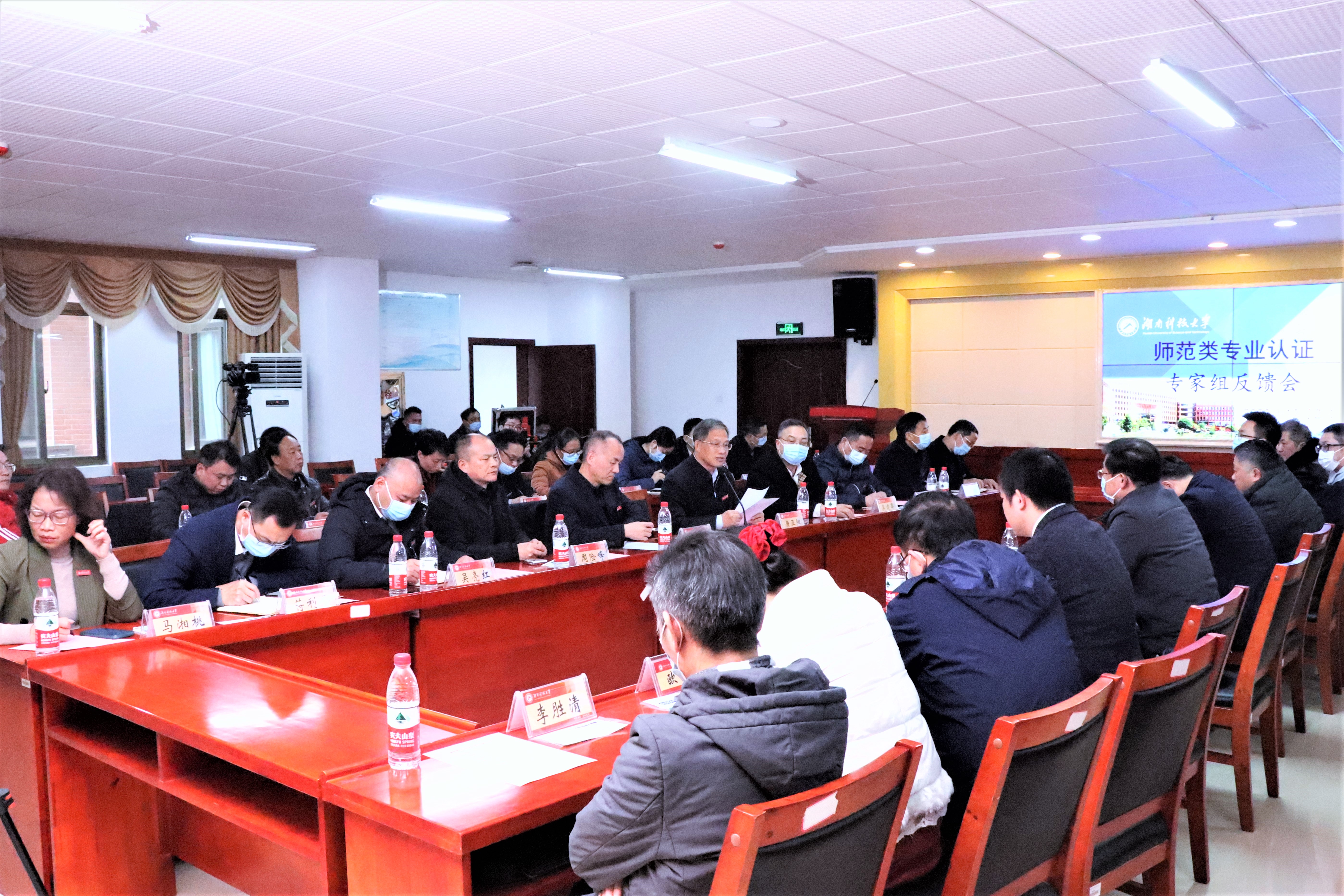 12月2日上午,人文学院汉语言文学师范类专业认证专家组反馈会于立功楼3-2会议室召开,认证专家就线上认证考查意见进行了反馈。湖南科技大学党委书记唐亚阳、副校长贺泽龙莅临本次会议。相关职能部门负责人、学校各师范专业负责人、人文学院负责人及中文系教师代表、承担汉语言文学专业基础课教学工作的相关学院教师代表出席现场会议,专家组成员以线上形式参会。本次会议由专家组组长王锋主持。