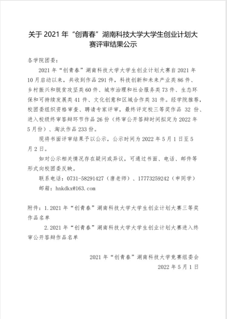关于2021年“创青春”湖南科技大学大学生创业计划大赛评审结果公示