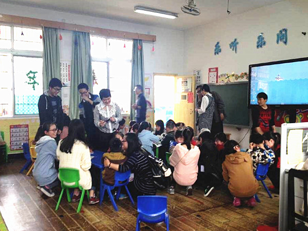 志愿者们分成几批,每两人陪伴一个儿童,与他们交流玩耍。“蒙眼前进”和“戴帽子比赛”两个游戏让小朋友们忘却了与陌生人接触的局促与羞涩。尤其在“蒙眼前进”这一游戏中,志愿者们牵着小朋友,大手拉小手,绕过眼前凳子,椅子等障碍物,一起走向终点,更是拉近了他们之间的距离。在玩闹中,志愿者们还细心地注意着每一个小朋友的情况,看到他们玩出汗了,还会用纸巾擦汗或者帮他们解开衣服。