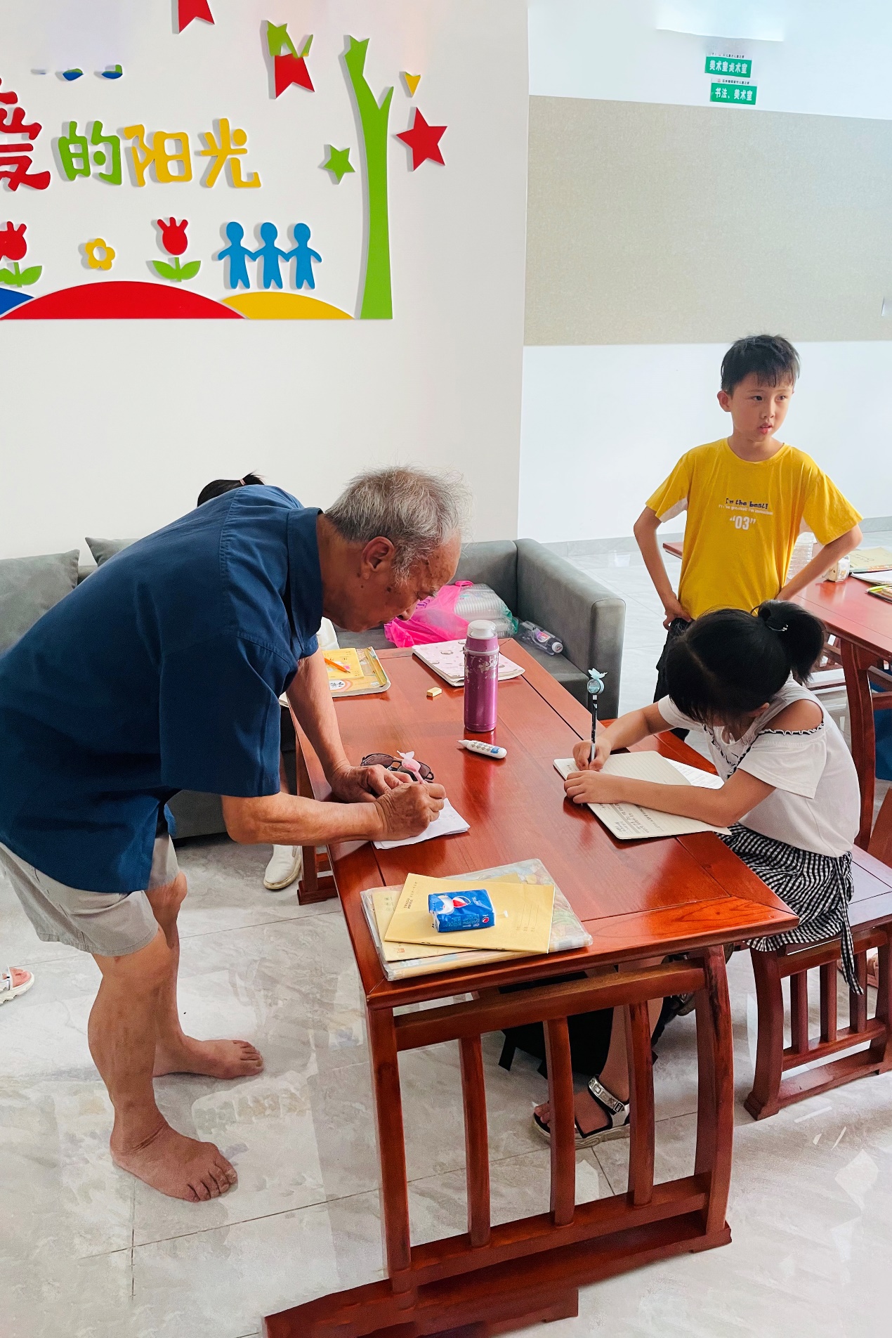 志愿者们积极热情的服务不仅让孩子们感受到学习的乐趣,同时也赢得了家长的信任。在教室外的凉亭中里,零星家长围坐闲谈。“今年暑假小孩没有去父母那,留在乡下,我就想着把他送到这学习。”徐塘斌的爷爷笑着说道。还在上幼儿园的汤丽荣“预定”了明年下半年的名额。汤丽荣的妈妈说,“今天带她来看看,了解一下情况,明年暑假再把她送到这里来上一年级。”