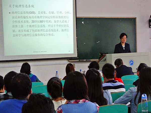 为了让学生更快地理解“汉语方言GIS”这个相对陌生的概念,刘教授以汉语声调数目分布为例,给师生展示经GIS分析的地图。师生们可以直观地看到,江苏南通至新疆塔城一线各方言点的声调数目由7减少到2,刘教授分析说:“使用GIS可以很清楚的看到方言与地理的联系,显然塔城受到了周边无声调的异族语言的影响,令自身语言声调种类减少。”