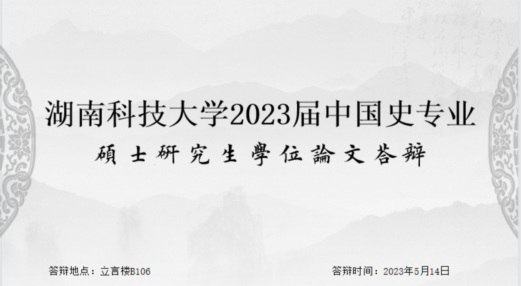 5月14日,人文学院2020级中国史专业硕士研究生学位论文答辩于立言楼B106如期举行。本次答辩邀请湘潭大学章育良教授担任答辩主席,湘潭大学吉成名教授以及我院徐红教授、金身佳教授、周方高教授、聂志军教授担任答辩委员。2020级中国古代史方向8位硕士研究生参与此次答辩。
